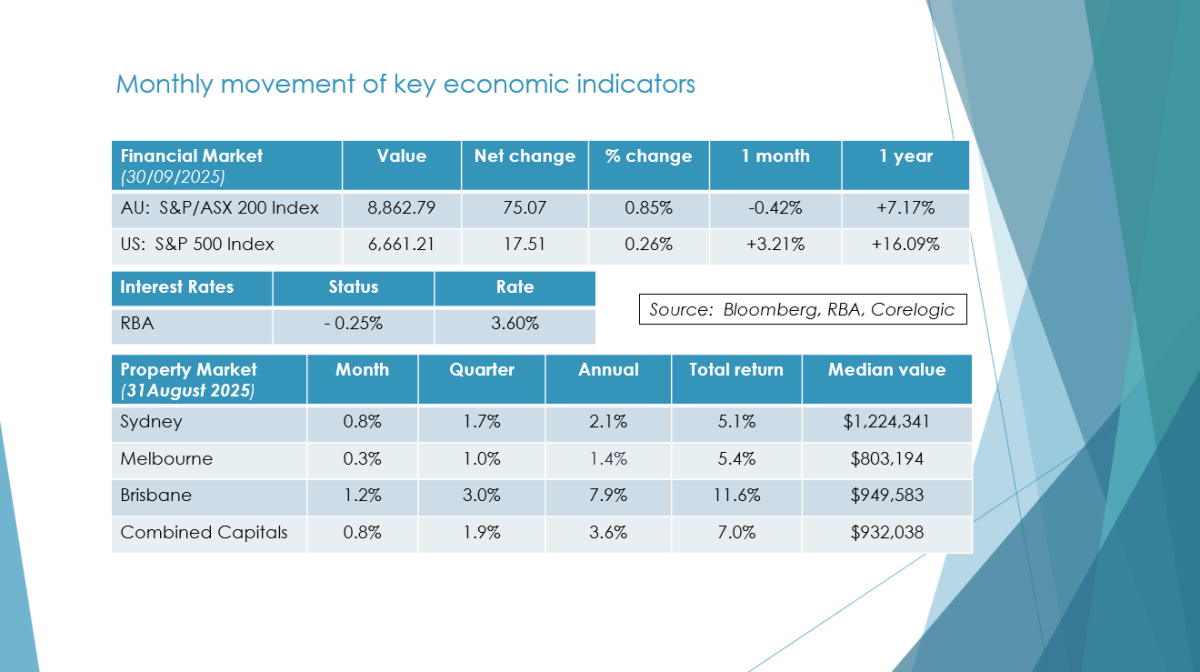 As anticipated the RBA kept their interest rates at 3.6% at their meeting yesterday. There is an expectation that rates will drop in November by 25 basis points. The intention being to get a balance between encouraging further investments and avoiding exuberance, and excess returns in the market.