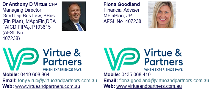 A reminder that we have much more detailed financial advice of a general nature on our website www.virtueandpartners.com.au and initial enquiries can be made at info@virtueandpartners.com.au